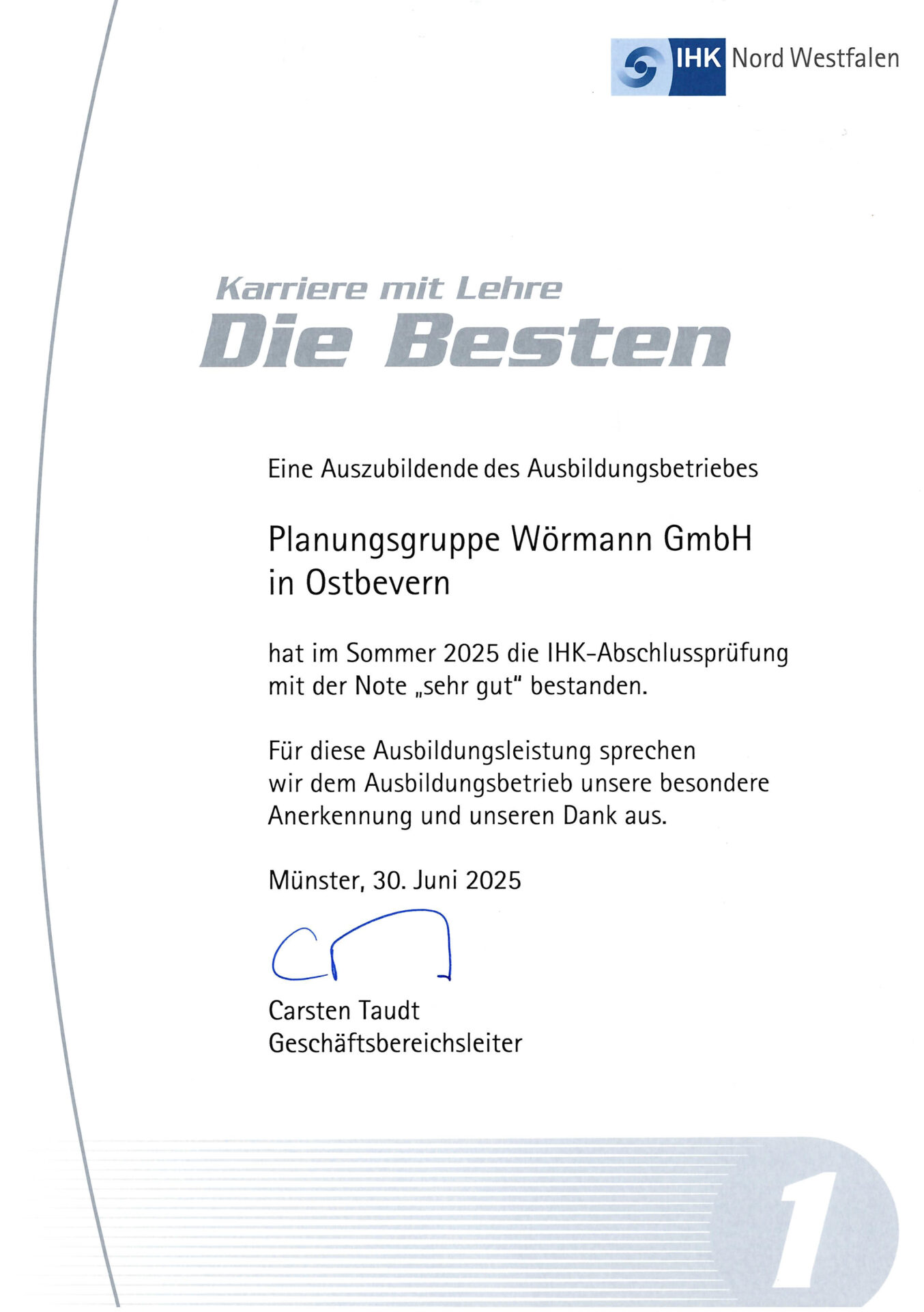 Nun haben auch wir eine Urkunde von der IHK erhalten. Damit wurde uns großer Dank und Anerkennung für unser Engagement als Ausbildungsbetrieb ausgesprochen. Wir bedanken uns herzlich bei der IHK für diese Wertschätzung. Die Urkunde wird einen besonderen Platz in unserem Büro erhalten.