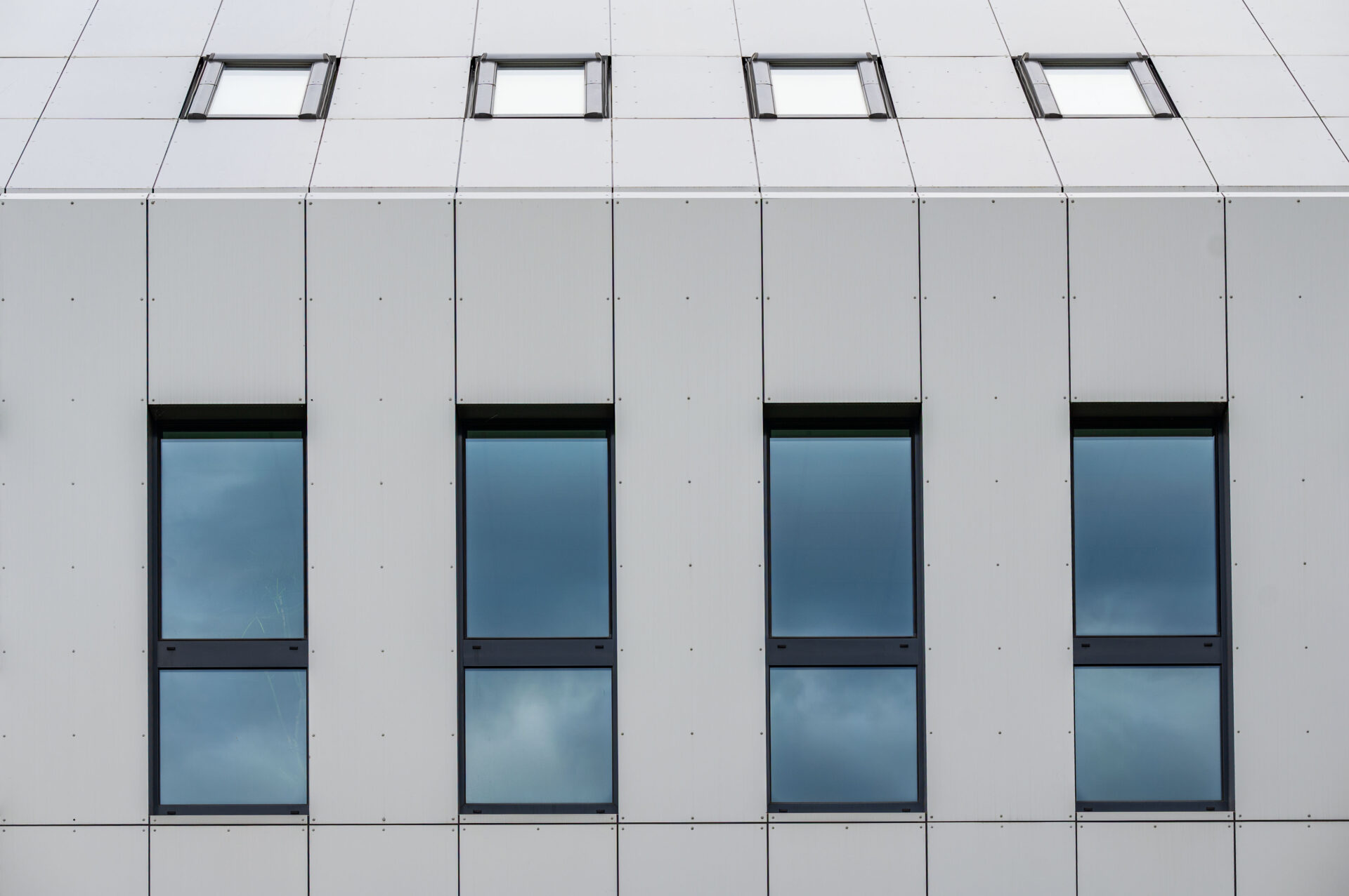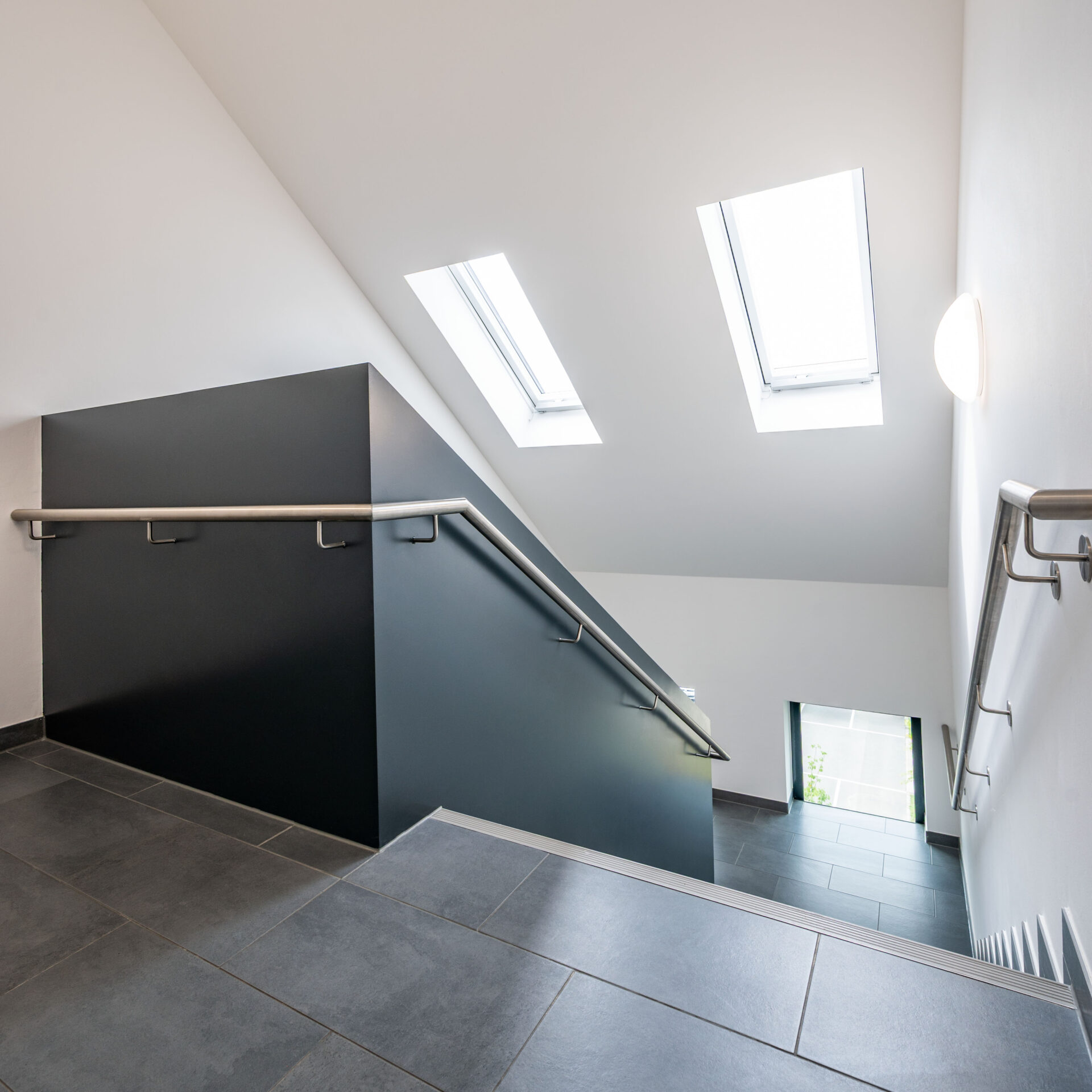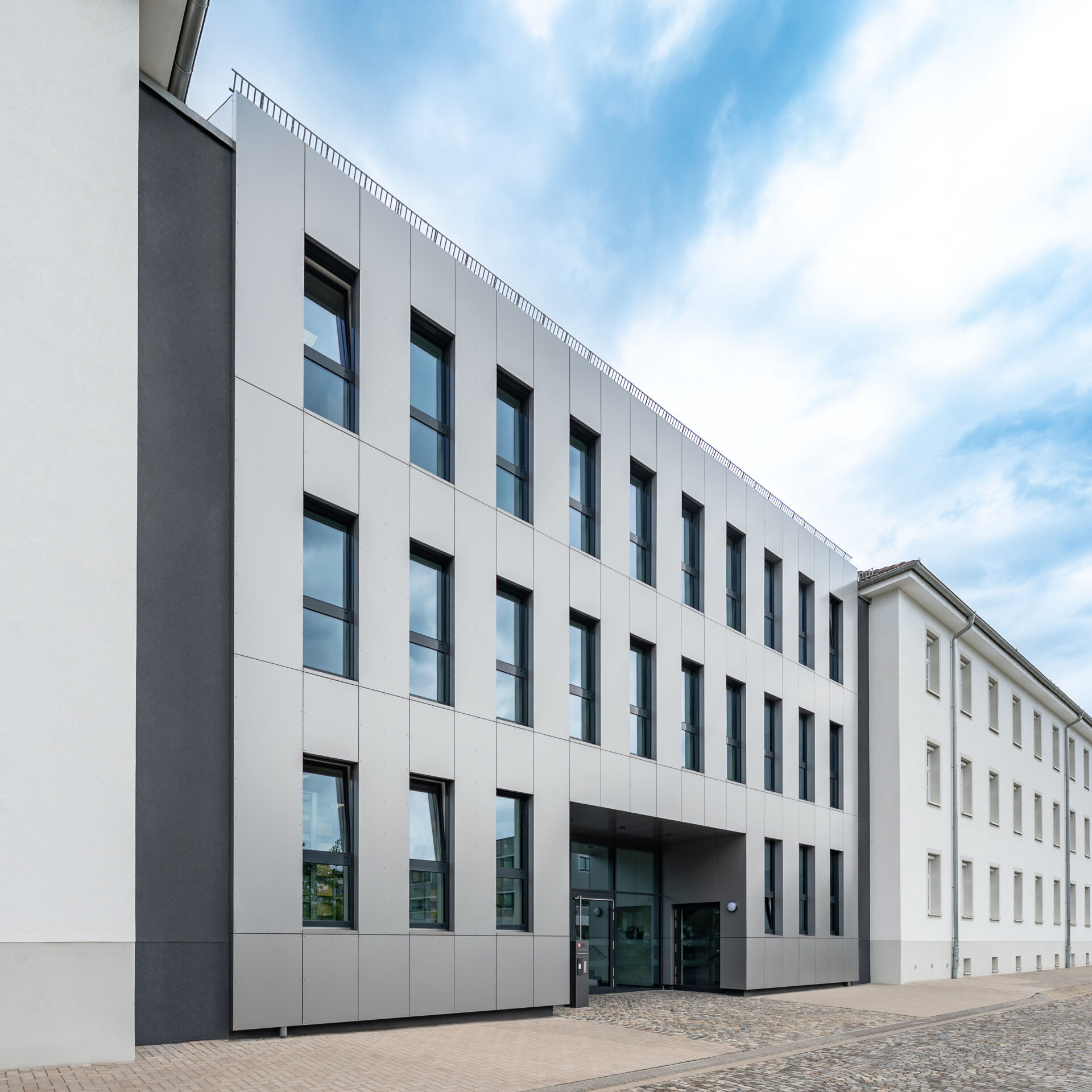Die Baumaßnahme umfasste die Sanierung zweier Bestandsgebäude sowie die Errichtung eines Neubaus, der die beiden vorhandenen Gebäude zu einem Gesamtensemble verbindet. Der Neubau fügt sich in seiner Kubatur harmonisch in den Bestand ein und wurde mit einer Aluminium-Fassade verkleidet, die ebenfalls zur kubischen Wirkung über das Satteldach hinweggeführt wurde.