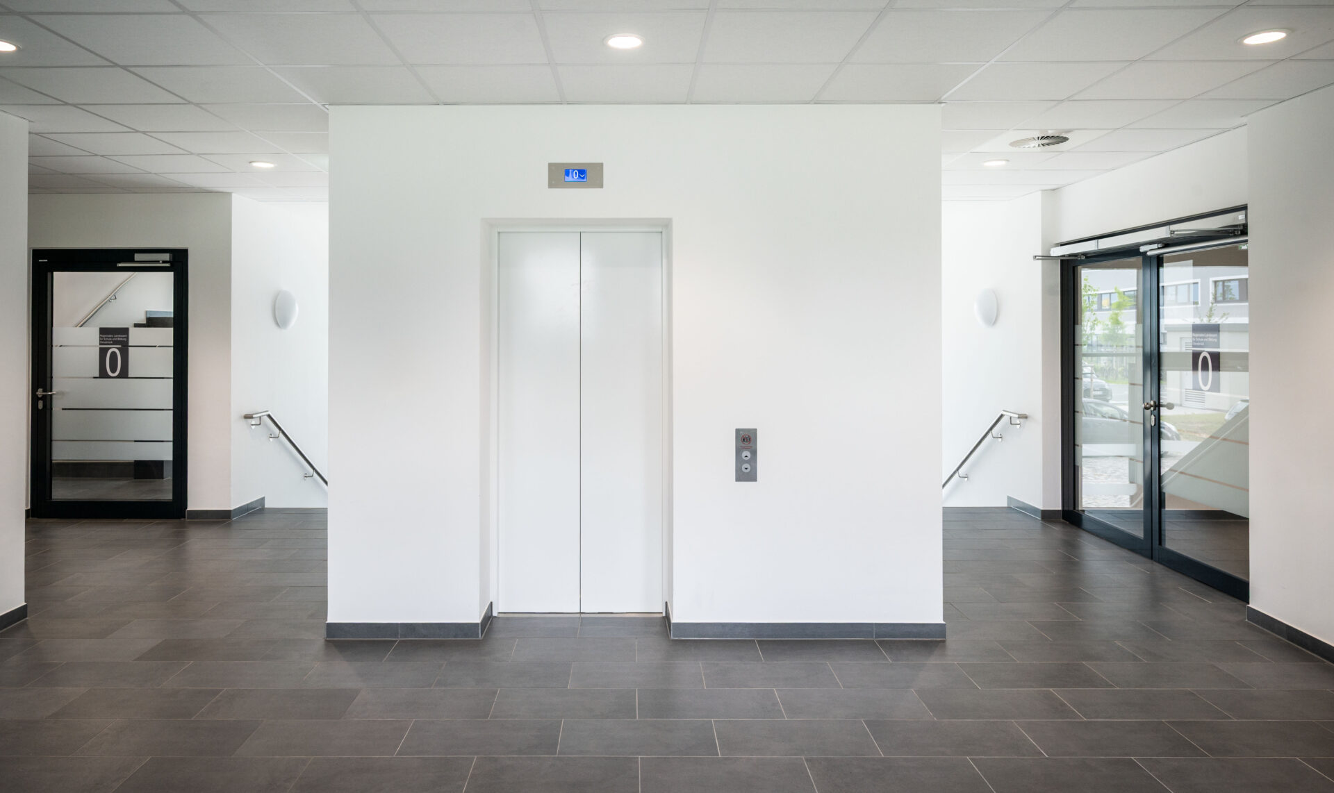 Das neue Zwischengebäude erhielt einen Aufzug, der als barrierefreier Erschließungskern alle Geschosse verbindet. In diesem Bereich befinden sich zentrale Funktionen: eine Wartezone mit Informations- und Hinweistafeln, Seminar- und Besprechungsräumen sowie eine Bücherei.