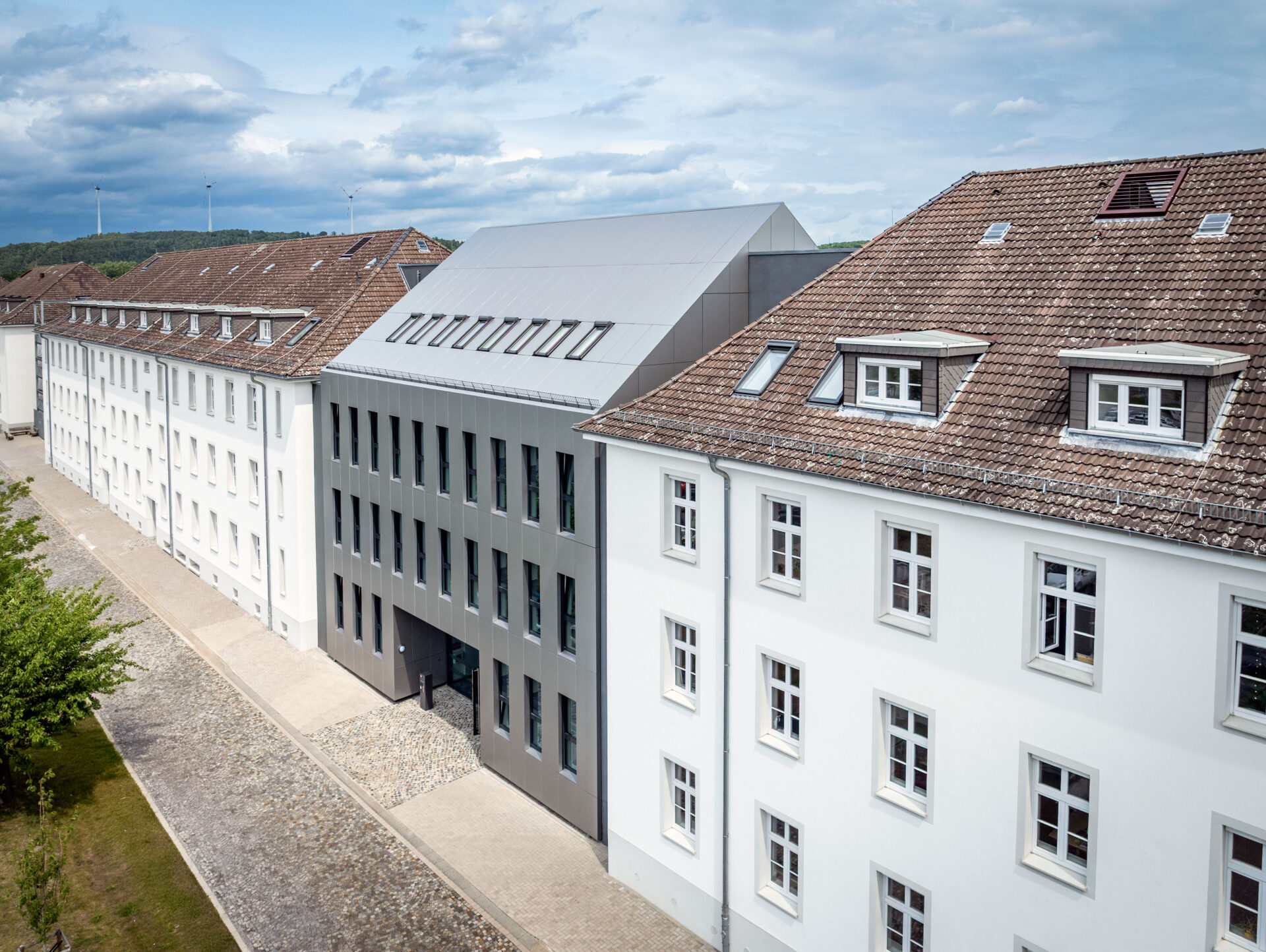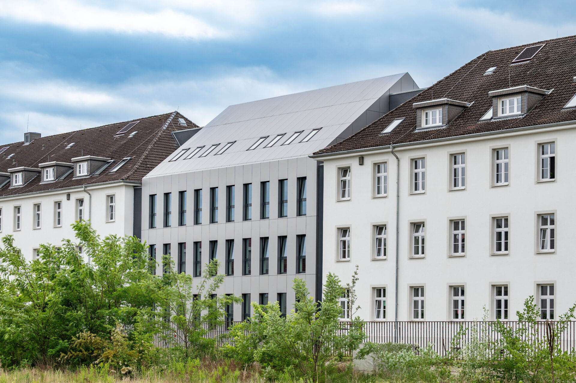 In den Fluren der ehemaligen Unterkunftsgebäude wurden die allgemeinen Funktionsbereiche – wie Kopierzonen, Sanitärräume, Teeküchen und Putzmittelräume – mittig angeordnet, um die Büroflächen effizient zu nutzen. Die dadurch entstehenden Aufweitungen in den Fluren eignen sich hervorragend als Kommunikationszonen.